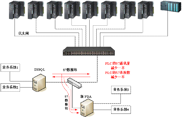 改造方案为只有INSQL直接从PLC采集数据,PLC与INSQL的S7数据包通过一台小交换机转发到PDA,PDA从这些转发的S7数据包中解析出数据,本方案对INSQL几乎无影响,但PLC总的S7数据包几乎减少一半,连接数也减少一半,如下图所示。