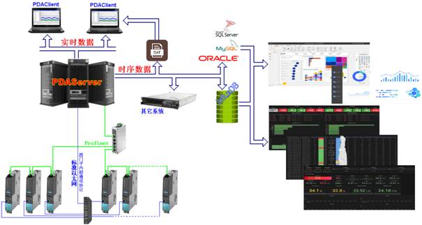 In order to isolate from the automated L1 system, signals with a sampling period of less than 10ms are collected through a dedicated PN network established by CBE20. For signals with no special requirements for sampling period, data is read from S120 through standard Ethernet using Siemens internal communication protocol. The PDA system saves the collected signals as. dat files and can also be saved to relational and temporal databases such as InfluxDB, making it convenient for various automatic reports and big data analysis such as Power BI, Fansoft, Grafana, etc. Multiple PDA servers need to be set up according to the geographical location and number of transmission systems in each factory.