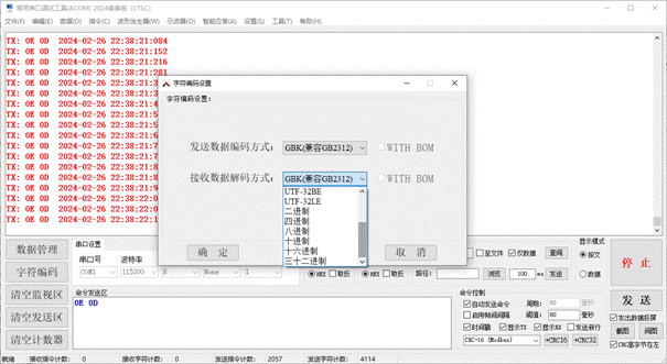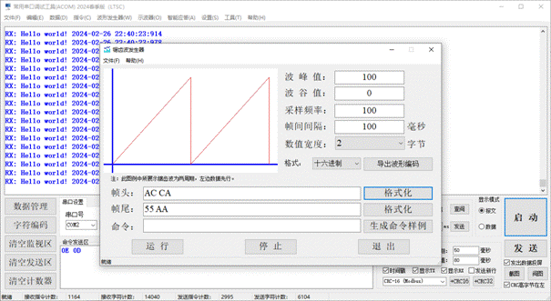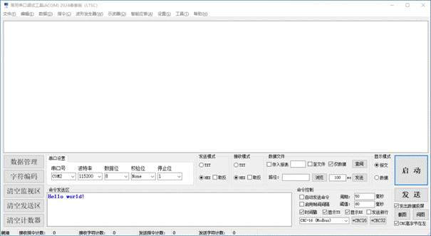 Supports 1. Serial port data transmission and reception; 2. Intelligent formatting commands; 3. Supports the following baud rates: 110, 300, 600, 1200, 2400, 4800, 9600, 14400, 19200, 38400, 56000, 57600, 74880, 76800, 115200, 128000, 153600, 230400, 256000, 307200, 460800, 614400, 921600, 1382400; 4. Support verification: None、even、odd、space、mark; 5. Support data bit lengths: 5, 6, 7, 8; 6. Support stop bit length: 0, 1, 2, 1.5; 7. Support adding CRC checksum; 8. Automatically save received data; 9. Support manual one click data saving; 10. Support querying historical data; 11. Support manual saving of received and sent data; 12. It has rich shortcut keys; 13. Automatic timed sending; 14. Send a new line (useful for sending AT commands); 15. Support hardware flow control; 16. Support data transmission and reception data volume statistics; 17. Supports data saving and can be exported as Excel files; 18. Supports data saving and can be exported as TXT files; 19. Support data saving to cloud database (MS SQL SERVER 2008); 20. Support data saving to local database (MS SQL SERVER 2022); 21. Supports the reception and transmission of characters such as GB2132, GBK, ASCII, UTF-7, UTF-8, UTF-16BE, UTF-16LE, UTF-32BE, and UTF-32LE (supporting WITH BOM and WITHOUT BOM); 22. Support independent, combined, and automatic cyclic sending of multiple commands, automatic cyclic combined sending, and support self set cycles; 23. Automatically remember user settings; 24. Provide sine wave generator function; 25. Provide cosine wave generator function; 26. Provide triangular wave generator function; 27. Provide sawtooth wave generator function; 28. Provide commonly used serial oscilloscope functions, with customizable frame headers; 29. Provide intelligent response function; 30. Provide string processing functionality; 31. Provide millisecond clock function; 32. Data reception and screen flashing support message mode and data mode; 33.STM32 series microcontroller timer frequency calculator (forward and backward); 34. Automatically discover new versions and inquire about updates; 35.Continuous version upgrades to provide better software services.