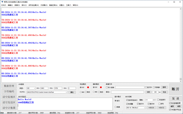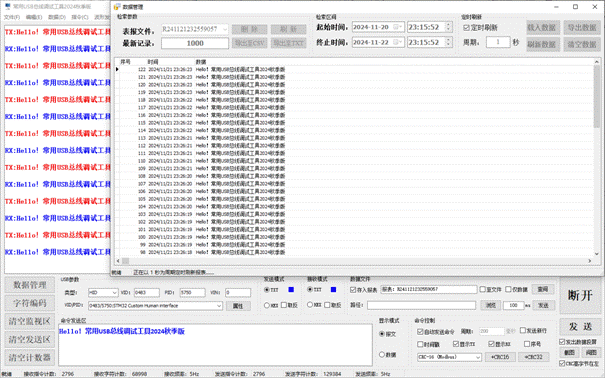 Support USB-HID data transmission and reception, text mode transmission and reception, HEX mode transmission and reception, message mode, data mode, data management function, data export to EXCEL report, and storage in database. The specific functions are as follows: 1. USB-HID data transmission and reception; 2. Intelligent formatting commands; 3. Support adding CRC check codes; 4. Automatically save received data; 5. Support manual one click data saving; 6. Support querying historical data; 7. Support manual saving of received and sent data; 8. It has rich shortcut keys; 9. Automatic timed sending; 10. Send a new line (useful for sending AT commands); 11. Support hardware flow control; 12. Support data transmission and reception data volume statistics; 13. Supports data saving and can be exported as Excel files; 14. Supports data saving and can be exported as TXT files; 15. Support data saving to a database (MS SQL Server); 16. Support data saving to a database (MySQL); 17. Supports the reception and transmission of characters such as GB2132, GBK, ASCII, UTF-7, UTF-8, UTF-16BE, UTF-16LE, UTF-32BE, and UTF-32LE (supporting WITH BOM and WITHOUT BOM); 18. Support independent, combined, and automatic cyclic sending of multiple commands, automatic cyclic combined sending, and support self set cycles; 19. Automatically remember user settings; 20. Provide sine wave generator function; 21. Provide cosine wave generator function; 22. Provide triangular wave generator function; 23. Provide sawtooth wave generator function; 24. Provide commonly used USB bus oscilloscope functions, with customizable frame headers; 25. Provide intelligent response function; 26. Provide string processing functionality; 27. Provide millisecond clock function; 28. Data reception and screen flashing support message mode and data mode; 29. STM32 series microcontroller timer frequency calculator (forward and backward); 30. Automatically discover new versions and inquire about updates; 31. Continuous version upgrades to provide better software services.