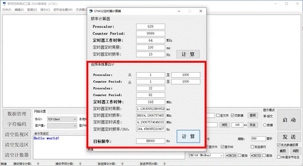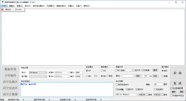 Supports TCP/IP Server, TCP/IP Client, UDP/IP data transmission and reception, text mode transmission and reception, HEX mode transmission and reception, message mode, data mode, data management functions, data export to EXCEL reports, and storage in databases. The specific functions are as follows: 1. TCP/IP Server, TCP/IP Client, UDP/IP data transmission and reception; 2. Intelligent formatting commands; 3. Support adding CRC check codes; 4. Automatically save received data; 5. Support manual one click data saving; 6. Support querying historical data; 7. Support manual saving of received and sent data; 8. It has rich shortcut keys; 9. Automatic timed sending; 10. Send a new line (useful for sending AT commands); 11. Support hardware flow control; 12. Support data transmission and reception data volume statistics; 13. Supports data saving and can be exported as Excel files; 14. Supports data saving and can be exported as TXT files; 15. Support data saving to a database (MS SQL Server); 16. Support data saving to a database (MySQL); 17. Supports the reception and transmission of characters such as GB2132, GBK, ASCII, UTF-7, UTF-8, UTF-16BE, UTF-16LE, UTF-32BE, and UTF-32LE (supporting WITH BOM and WITHOUT BOM); 18. Support independent, combined, and automatic cyclic sending of multiple commands, automatic cyclic combined sending, and support self set cycles; 19. Automatically remember user settings; 20. Provide sine wave generator function; 21. Provide cosine wave generator function; 22. Provide triangular wave generator function; 23. Provide sawtooth wave generator function; 24. Provide commonly used serial oscilloscope functions, with customizable frame headers; 25. Provide intelligent response function; 26. Provide string processing functionality; 27. Provide millisecond clock function; 28. Data reception and screen flashing support message mode and data mode; 29. STM32 series microcontroller timer frequency calculator (forward and backward); 30. Automatically discover new versions and inquire about updates; 31. Continuous version upgrades to provide better software services.