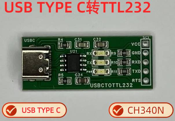 The USB TYPE C interface is converted to TTL232 serial port, with a main chip of CH340N and a VCC voltage of 5V. It is only used for serial data transmission and reception, and only needs to be connected to the RXD, TXD, and GND pins. Recommended to be used in conjunction with the "Common Serial Debugging Tools 2025 Spring Edition".