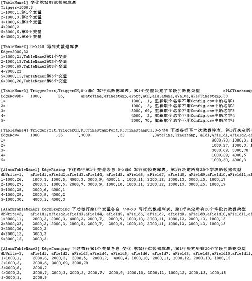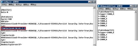 dbUpgradeRtTS.ini configures the trigger conditions for real-time database writing and which variables are written to which database table. dbUpgradeRtTS.exe calls influx_Rt.exe writes the database table in real-time according to the configuration file dbUpgradeRtTS.ini when one of the seven triggering conditions is met, or unconditionally once per second, with the ability to write tens of thousands of points per second. It supports triggering frequency at the 0.1 second level, and the field name written to influx should be correctly configured in the FFS column of Config.csv. The IP and file path configuration is shown in the following figure. dbUpgradeRtTSSr.exe can update files that have not been uploaded in the past 7 days, scan every 12 hours, and automatically delete temporary files 10 days ago.