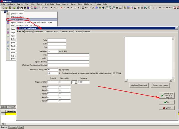 The system parameters include the location where the data file is saved, the prefix and suffix of the data file name, the duration of the data file, the retention days, the watchdog, automatic monitoring, and quality data recording.