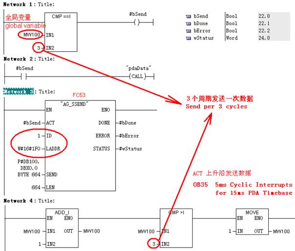 , ,4 ,0.000000,1.000000,REAL,0 ,0.000,0.000,0.000,0.000,0 , …… CH300=, , , ,4 ,0.000000,1.000000,REAL,0 ,0.000,0.000,0.000,0.000,0 , The Tcp protocol is similar. In order to ensure the data consistency, the pdaData function block is located before the transmission function block. The hardware address of PIxxx PQxxx from DP network should not be put into the pdaData which prevent CPU failure due to DP and other network disconnection, they may be converted in OB1. With the increase of the