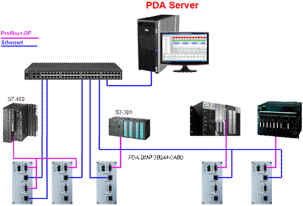 There are two alone DP interface in the PDA DP bridge of "PDA DPM-2B244-0AB0", they may be connected to two DP segments, 244 bytes of per DP segment are send to the PDA server by ethernet, pda244.gsd is its configuration file, multiple DP bridge can be linked in series when the sampling points is too much. PDA sample period may be 0.5ms. For S7-400/S7-300 acquisition procedures should be in the OB1, the effective sampling period is same as OB1 scan cycle.