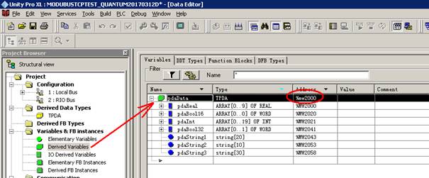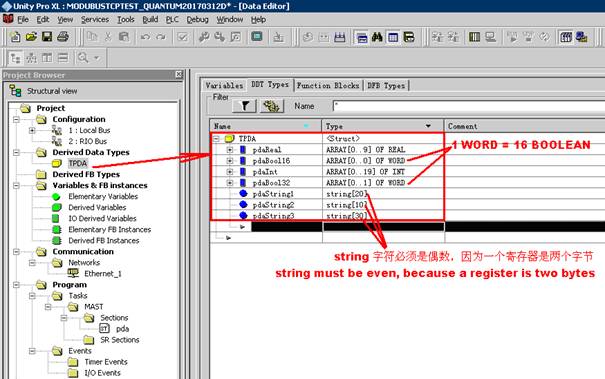 4. Define DDT type TPDA according to variables collected, 10*REAL+16*BOOL+20*INT+32*BOOL+String1+String2+String3, A WORD is equal to BOOL*16.