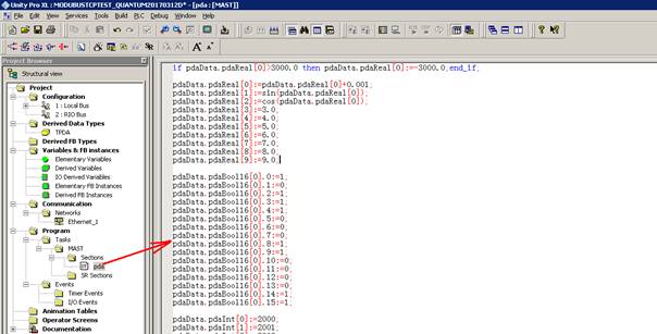 pdaData.pdaReal[0]:=-3000.0;end_if; pdaData.pdaReal[0]:=pdaData.pdaReal[0]+0.001; pdaData.pdaReal[1]:=sin(pdaData.pdaReal[0]); pdaData.pdaReal[2]:=cos(pdaData.pdaReal[0]); pdaData.pdaReal[3]:=3.0; pdaData.pdaReal[4]:=4.0; pdaData.pdaReal[5]:=5.0; pdaData.pdaReal[6]:=6.0; pdaData.pdaReal[7]:=7.0; pdaData.pdaReal[8]:=8.0; pdaData.pdaReal[9]:=9.0; pdaData.pdaBool16[0].0:=1; pdaData.pdaBool16[0].1:=0; pdaData.pdaBool16[0].2:=1; pdaData.pdaBool16[0].3:=1; pdaData.pdaBool16[0].4:=1; pdaData.pdaBool16[0].5:=0; pdaData.pdaBool16[0].6:=0; pdaData.pdaBool16[0].7:=0; pdaData.pdaBool16[0].8:=1; pdaData.pdaBool16[0].9:=1; pdaData.pdaBool16[0].10:=0; pdaData.pdaBool16[0].11:=0; pdaData.pdaBool16[0].12:=0; pdaData.pdaBool16[0].13:=0; pdaData.pdaBool16[0].14:=1; pdaData.pdaBool16[0].15:=1; pdaData.pdaInt[0]:=2000; pdaData.pdaInt[1]:=2001; pdaData.pdaInt[2]:=2002; pdaData.pdaInt[3]:=2003; pdaData.pdaInt[4]:=2004; pdaData.pdaInt[5]:=2005; pdaData.pdaInt[6]:=2006; pdaData.pdaInt[7]:=2007; pdaData.pdaInt[8]:=2008; pdaData.pdaInt[9]:=2009; pdaData.pdaInt[10]:=2010; pdaData.pdaInt[11]:=2011; pdaData.pdaInt[12]:=2012; pdaData.pdaInt[13]:=2013; pdaData.pdaInt[14]:=2014; pdaData.pdaInt[15]:=2015; pdaData.pdaInt[16]:=2016; pdaData.pdaInt[17]:=2017; pdaData.pdaInt[18]:=2018; pdaData.pdaInt[19]:=2019; pdaData.pdaBool32[0].0:=1; pdaData.pdaBool32[0].1:=1; pdaData.pdaBool32[0].2:=1; pdaData.pdaBool32[0].3:=0; pdaData.pdaBool32[0].4:=0; pdaData.pdaBool32[0].5:=0; pdaData.pdaBool32[0].6:=1; pdaData.pdaBool32[0].7:=1; pdaData.pdaBool32[0].8:=1; pdaData.pdaBool32[0].9:=1; pdaData.pdaBool32[0].10:=0; pdaData.pdaBool32[0].11:=0; pdaData.pdaBool32[0].12:=0; pdaData.pdaBool32[0].13:=0; pdaData.pdaBool32[0].14:=1; pdaData.pdaBool32[0].15:=1; pdaData.pdaBool32[1].0:=1; pdaData.pdaBool32[1].1:=1; pdaData.pdaBool32[1].2:=1; pdaData.pdaBool32[1].3:=0; pdaData.pdaBool32[1].4:=0; pdaData.pdaBool32[1].5:=0; pdaData.pdaBool32[1].6:=0; pdaData.pdaBool32[1].7:=0; pdaData.pdaBool32[1].8:=1; pdaData.pdaBool32[1].9:=1; pdaData.pdaBool32[1].10:=1; pdaData.pdaBool32[1].11:=1; pdaData.pdaBool32[1].12:=1; pdaData.pdaBool32[1].13:=1; pdaData.pdaBool32[1].14:=0; pdaData.pdaBool32[1].15:=0; pdaData.pdaString1:='a1234567890xxxxxxxxb'; pdaData.pdaString2:='cyyyyyyyyd'; pdaData.pdaString3:='ezzzzzzzzzzzzzzzzzzzzzzzzzzf'; Config.csv in PDA server is below: [1000,81CH,10.000ms,192.168.0.211,28S,Note,192.168.0.216,,,,FC3,%MW2000] No,