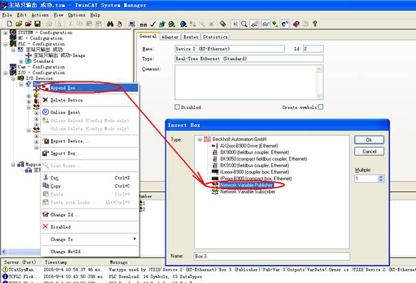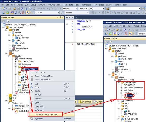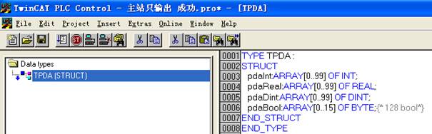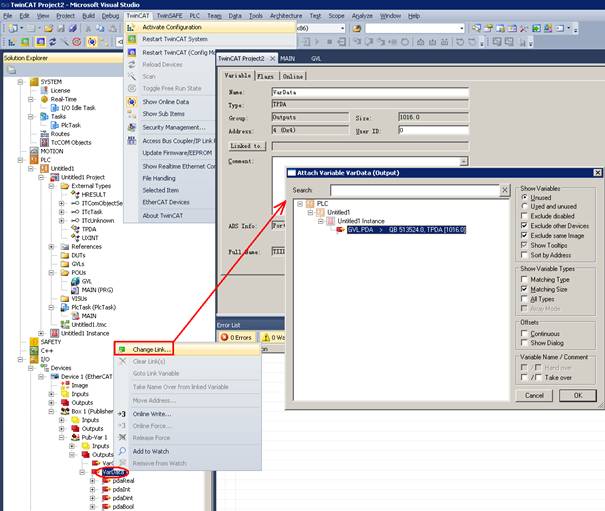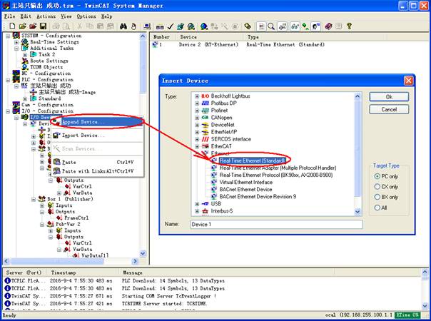 The example program can be found in RT-Ethernet_TwinCAT2.zip. 30.2 TwinCAT3If you want to simulate running on a computer, please turn off the VT (Virtualization Technology) virtualization function in the BIOS, otherwise an error will occur. In TwinCAT3, the defined structure TPDA is added to External Types so that the TPDA type can be selected when sending data. The example program can be found in RT-Ethernet_TwinCAT3.zip.