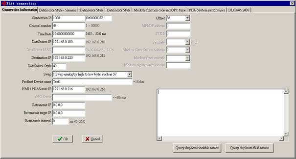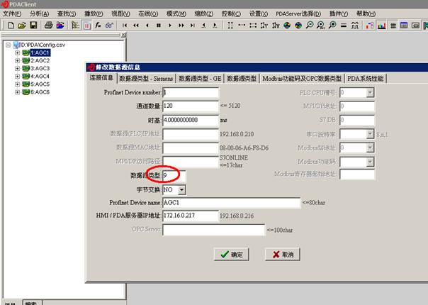 , ,4 ,0.000000,1.000000,INT ,0 5.2 PDA server as Profinet slave drop at TDCA slave station can only receive 240 bytes, the last byte is Device number, so the valid data is 239 bytes, the PDA data source type is 9. set the Profinet network attribute as below.