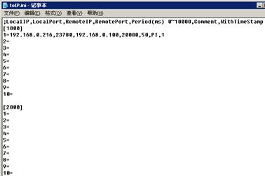 This task is executed by Retransfer.exe, the forwarding period is an integer multiple of 10ms. Retransfer.ini is the configure file. Type 0: Combine data from different connection channels and send to the destination IP using UDP. The configuration example is as follows, the period is used to set the period (ms). Type 1: Retransfer all data of the connection, the efficiency is lower than the previous method. [ToL2] style=0,挑变量转发 WithTimeStamp=1,是否带时间戳如 targetIP=192.168.0.220 targetPort=3010 period=20 1=1000,1 2=1000,2 3=1000,3 4=1000,36 5=1000,37 6=1000,4 7=2000,3 8=2000,8 9=2000,32 10=3000,12 11=3000,20 12=4000,2 13=4000,3 [ToL3] style=0,挑变量转发 WithTimeStamp=0 targetIP=192.168.0.221 targetPort=3020 period=25 1=1000,10 2=1000,20 3=1000,30 4=1000,22 5=2000,31 6=2000,2 7=2000,32 8=3000,11 9=3000,20 10=4000,1 11=4000,2 [ToQuality] style=1,转发整个连接 WithTimeStamp=0 targetIP=192.168.0.222 targetPort=3050 period=50 1=1000 [ToDevice] style=1,转发整个连接 WithTimeStamp=0 targetIP=192.168.0.223 targetPort=3060 period=50 1=3000