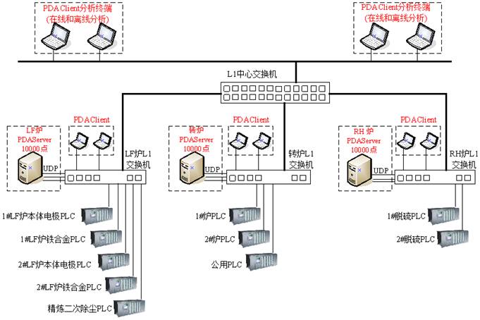 Add one set of PDA high-speed data acquisition and analysis system to each area, as shown in Figure 1. (1) The advantage of this solution is that each system is relatively independent, and maintenance and power outages do not affect each other. The data traffic of the backbone Ethernet network will not increase significantly. (2) The PDA system adopts Ethernet communication method, Profinet and UDP protocol. (3) One set of 10000 point PDA system in LF furnace area. (4) One set of PDA system with 10000 points in the converter area. (5) One set of PDA system with 10000 points in RH furnace area. (6) 3 sets of PDA systems, slightly higher cost, but the high-frequency Ethernet data flow in each area is limited to the local network. (7) This PDA system has a high cost performance ratio, using multiple solutions, and the cost increase is not significant. (8) Any computer connected to L1 Ethernet can perform online and offline data analysis.