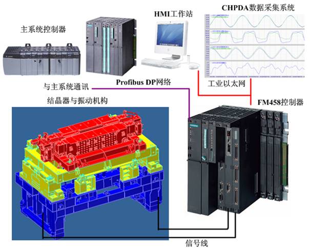 Crystallizer is the core equipment of continuous casting machine. Compared with mechanical vibration, hydraulic vibration can effectively reduce the frictional resistance between the casting billet and the copper tube of the crystallizer, thereby improving the surface quality of the casting billet, increasing the pulling speed, and increasing the output; Adopting plate spring guidance, there is no mechanical wear, greatly reducing equipment maintenance workload and costs; Adopting high-precision prestressed leaf spring guidance, with small deviation in all directions; Online adjustable amplitude, frequency, and waveform to achieve sinusoidal and non sinusoidal vibration, suitable for the pouring process requirements of various steel grades. Debugging personnel can adjust various parameters based on the waveform to make feedback and settings follow as quickly as possible with minimal overshoot. Sometimes, blockage of servo valves due to unclean hydraulic system oil can be intuitively analyzed from the curve, which can quickly identify the cause. Generally, production workers can adjust the historical curve after discovering that the vibration has stopped, and quantitatively analyze whether it is signal interference, excessive friction, oil circuit blockage, or improper operation. Compared with the traditional eccentric cam crystallizer excitation system driven by DC or AC motors, the electro-hydraulic servo driven continuous casting crystallizer excitation system can achieve non sinusoidal vibration, significantly improve the lubrication of crystallizer protective slag, effectively reduce the friction between the billet and the crystallizer, thereby reducing billet vibration marks, improving billet quality and metal yield. The PDA system is used for real-time data acquisition and monitoring of the crystallizer vibration device, with a sampling period of 2ms. The collected data includes actual displacement, actual pressure, actual pulling speed, and actual servo valve status. It is a necessary tool for fault diagnosis and data analysis. 57.1 S7-400+FM458 scheme