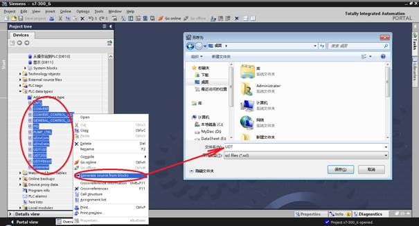 To generate and export the source file for the user defined function block FB and UDT called to AWL file, Generate source from blocks to .scl file for FB and its UDT in Portal.