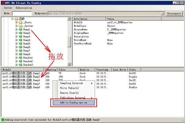 将需要采集的信号拖放到监视表格中,右键菜单将所选的变量导出到Config.opc.ua文本文件,可复制粘贴到Config.csv,注意ns。