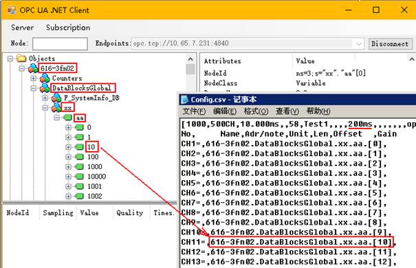 其它的类同上节。 Opc Ua的点名与PDA的点名对应关系如下图,每级用“.”分隔,数组下标用“[”“]”括起来,多维数组如.[2,3,2]。下图中200ms是PLC中Opc Ua最小采样间隔时间,PDA中要与PLC中设置的一致。