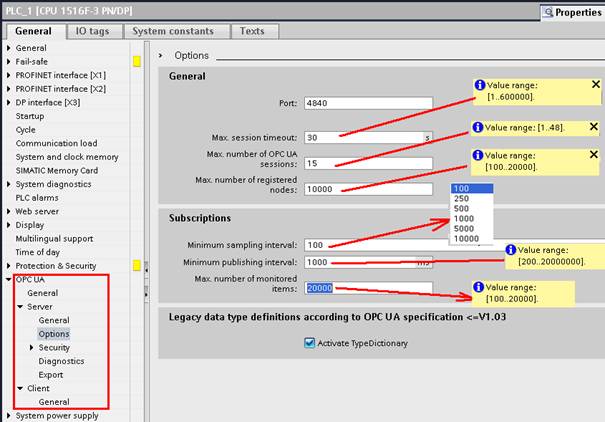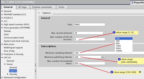 每种PLC依据其自身性能提供Opc Ua访问的点数和采样周期不一样,下图是S7