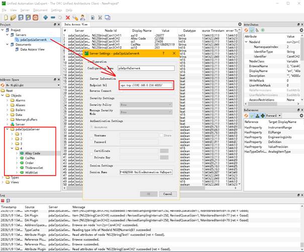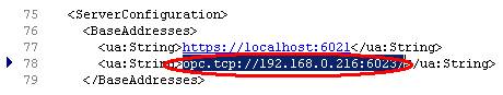 Ua的Node结点,Config.csv中Field列为BrowseName,Name列为DisplayName,Id列为Description。 修改文件Quickstarts.ReferenceServer.Config.xml如下,指定pdaOpcUaServer绑定的IP和端口,也可填入localhost通过任意网卡访问数据。
