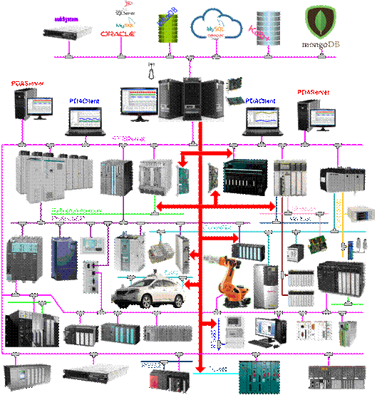 Boolean) 混排 1.2 采样周期 0.05ms ~ 10ms 1.3 数据压缩 实时压缩:注重实时性和效率。 高效压缩:高的压缩比,注重压缩率。 不压缩:注重开放性。 1.4 数据采集方式 工业以太网、Profibus-DP、RFM、TC-net网等网络采集。 硬件接口模块采集。 PLC主动发送数据,PDA服务器接收。 PDA服务器直接读取PLC中的数据。 数据打包传送。 1.5 数据接口 支持Dos、Windows32/64、Linux32/64、Android、Mac OS、iOS等平台 完全开放的历史数据接口、全面兼容第三方数据、插件 视频同步数据接口 在线数据接口 数据文件生成完成接口 完全开放的实时数据接口 Oracle等数据库实时接口 质量管理系统及大数据接口(内存指针+数据文件) HMI接口(内存指针+数据文件) 高速转发、ModbusTcp、DDE、Opc Ua、MQTT、Kafka、WebSocket 1.6 系统结构和网络拓扑图