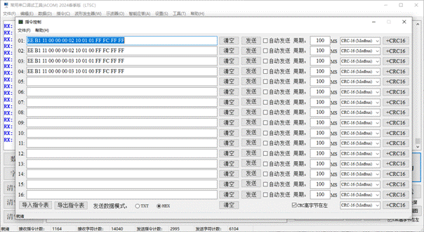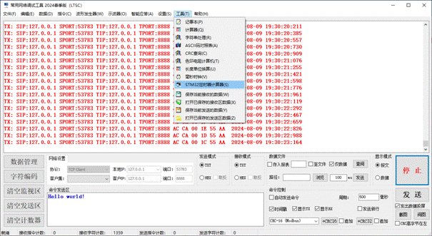 Supports TCP/IP Server, TCP/IP Client, UDP/IP data transmission and reception, text mode transmission and reception, HEX mode transmission and reception, message mode, data mode, data management functions, data export to EXCEL reports, and storage in databases. The specific functions are as follows: 1. TCP/IP Server, TCP/IP Client, UDP/IP data transmission and reception; 2. Intelligent formatting commands; 3. Support adding CRC check codes; 4. Automatically save received data; 5. Support manual one click data saving; 6. Support querying historical data; 7. Support manual saving of received and sent data; 8. It has rich shortcut keys; 9. Automatic timed sending; 10. Send a new line (useful for sending AT commands); 11. Support hardware flow control; 12. Support data transmission and reception data volume statistics; 13. Supports data saving and can be exported as Excel files; 14. Supports data saving and can be exported as TXT files; 15. Support data saving to a database (MS SQL Server); 16. Support data saving to a database (MySQL); 17. Supports the reception and transmission of characters such as GB2132, GBK, ASCII, UTF-7, UTF-8, UTF-16BE, UTF-16LE, UTF-32BE, and UTF-32LE (supporting WITH BOM and WITHOUT BOM); 18. Support independent, combined, and automatic cyclic sending of multiple commands, automatic cyclic combined sending, and support self set cycles; 19. Automatically remember user settings; 20. Provide sine wave generator function; 21. Provide cosine wave generator function; 22. Provide triangular wave generator function; 23. Provide sawtooth wave generator function; 24. Provide commonly used serial oscilloscope functions, with customizable frame headers; 25. Provide intelligent response function; 26. Provide string processing functionality; 27. Provide millisecond clock function; 28. Data reception and screen flashing support message mode and data mode; 29. STM32 series microcontroller timer frequency calculator (forward and backward); 30. Automatically discover new versions and inquire about updates; 31. Continuous version upgrades to provide better software services.