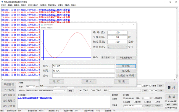 Support USB-HID data transmission and reception, text mode transmission and reception, HEX mode transmission and reception, message mode, data mode, data management function, data export to EXCEL report, and storage in database. The specific functions are as follows: 1. USB-HID data transmission and reception; 2. Intelligent formatting commands; 3. Support adding CRC check codes; 4. Automatically save received data; 5. Support manual one click data saving; 6. Support querying historical data; 7. Support manual saving of received and sent data; 8. It has rich shortcut keys; 9. Automatic timed sending; 10. Send a new line (useful for sending AT commands); 11. Support hardware flow control; 12. Support data transmission and reception data volume statistics; 13. Supports data saving and can be exported as Excel files; 14. Supports data saving and can be exported as TXT files; 15. Support data saving to a database (MS SQL Server); 16. Support data saving to a database (MySQL); 17. Supports the reception and transmission of characters such as GB2132, GBK, ASCII, UTF-7, UTF-8, UTF-16BE, UTF-16LE, UTF-32BE, and UTF-32LE (supporting WITH BOM and WITHOUT BOM); 18. Support independent, combined, and automatic cyclic sending of multiple commands, automatic cyclic combined sending, and support self set cycles; 19. Automatically remember user settings; 20. Provide sine wave generator function; 21. Provide cosine wave generator function; 22. Provide triangular wave generator function; 23. Provide sawtooth wave generator function; 24. Provide commonly used USB bus oscilloscope functions, with customizable frame headers; 25. Provide intelligent response function; 26. Provide string processing functionality; 27. Provide millisecond clock function; 28. Data reception and screen flashing support message mode and data mode; 29. STM32 series microcontroller timer frequency calculator (forward and backward); 30. Automatically discover new versions and inquire about updates; 31. Continuous version upgrades to provide better software services.