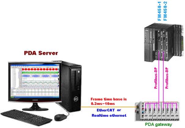 You can send the data to the S7-400 CPU through the backplane if the FM458 high-speed collection of points is less, it packs and sends data through ethernet, see the previous section. The following figure scheme can be used when the number of collected points are many, each of the FM458 CPU can acquire 244*4=976 bytes by DP to the real-time Ethernet.