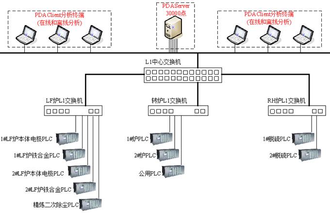 Add one set of PDA high-speed data acquisition and analysis system to each area, as shown in Figure 1. (1) The advantage of this solution is that each system is relatively independent, and maintenance and power outages do not affect each other. The data traffic of the backbone Ethernet network will not increase significantly. (2) The PDA system adopts Ethernet communication method, Profinet and UDP protocol. (3) One set of 10000 point PDA system in LF furnace area. (4) One set of PDA system with 10000 points in the converter area. (5) One set of PDA system with 10000 points in RH furnace area. (6) 3 sets of PDA systems, slightly higher cost, but the high-frequency Ethernet data flow in each area is limited to the local network. (7) This PDA system has a high cost performance ratio, using multiple solutions, and the cost increase is not significant. (8) Any computer connected to L1 Ethernet can perform online and offline data analysis.