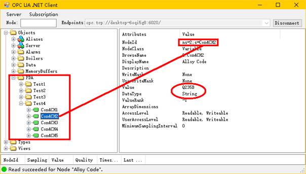 Extract PDAOpcUaServer. zip to the \ PDA \ directory, \ PDA \ PDAOpcUaServer \ PDAOpcUaServer A.exe reads real-time data from PDAServer and writes it to the node of Opc Ua. The Field column in Config. csv is BrowseName, the Name column is DisplayName, and the Id column is Description. Modify the file Quickstarts.ReferenceServer.Config.xml as follows, specifying the IP and port bound to PDAOpcUaServer.