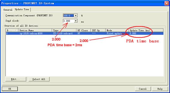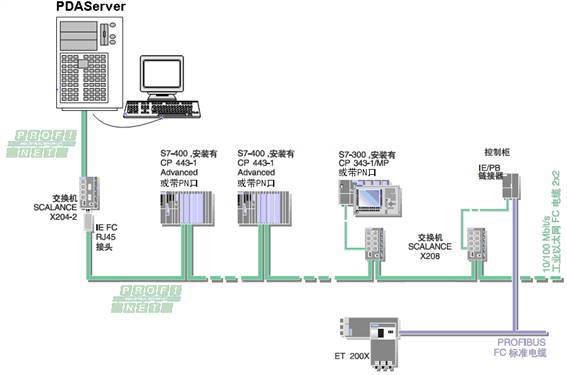 图5.1 支持Profinet现场总线的国家和地区 标准版 PDA 系统按 CP-1616 onboard V2.3 配置 Profinet 从站,采集的字节数为 128 的倍数,每个从站最多可采集 128*11=1408 字节,见下图,可增加多个从站采集更多的数据。 Profinet 最终还是依据 MAC 地址传送数据,因此一般同一个 PN 口的不同从站在 PDA 服务器中需要不同的网卡与之对应,PDA 服务器支持多网卡。 PDA服务器一个以太网络适配器分配多个IP地址,每个连接指定不同的FrameID(数据帧ID号),一个PLC 的以太网络适配器与PDA服务器一个以太网络适配器间可以建立多个PN连接通道。 例子程序需要时请索取。 PDA CPU 315-2 PN_DP Profinet CP1616 onboard V2.3 1408bytes.rar PDA CPU 319-3 PN_DP Profinet CP1616 onboard V2.3 1152+1408 Bytes.rar PDA CPU 414-2 DP Profinet CP1616 onboard V2.3 1408+1408Bytes.rar S7-400 CPU 所带 PN 口输出 1408 字占用 CPU 时间在 1ms 以内,通过单独的 Profinet 网卡输出1408 字节占用的 CPU 时间为 7ms 左右,这是因为数据经过背板总线传送需要时间。 5.1 S7-300/400/1500中PDA服务器作为PN从站 Profinet设备名不能是空字符串。PQB必须配置为连续的地址。 OB1中将DB100中需要采集的数据拷到输出地址(与PLC硬件组态中的地址要一致)。 数据源类型为8。 通过交换机,一台PDA服务器可采集多台PLC数据,服务器中无需专用的Profinet板卡CP-1616,PDA将Profinet协议集成到普通以太网卡中了。